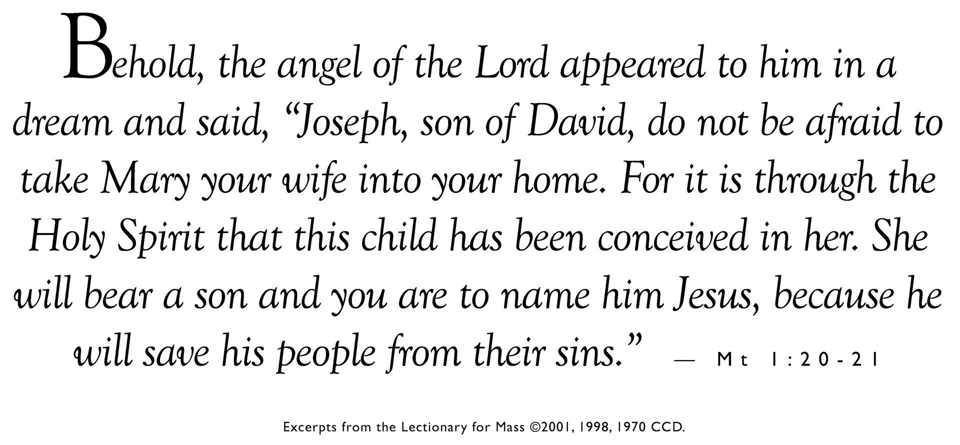 “Joseph, son of David, do not be afraid to take Mary your wife into your home. For it is through the Holy Spirit that this child has been conceived in her. She will bear a son and you are to name him Jesus,because he will save his people from their sins.” (Mt 1:20-21)
